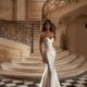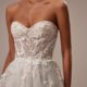 O vestido Marygold da Milla Nova apresenta uma silhueta princesa em tule, com apliques florais volumétricos. Destaque para o decote em V profundo, fechamento com amarração e zíper, e a saia cheia bordada com apliques florais 3D, ideal para noivas que buscam um visual romântico e encantador.